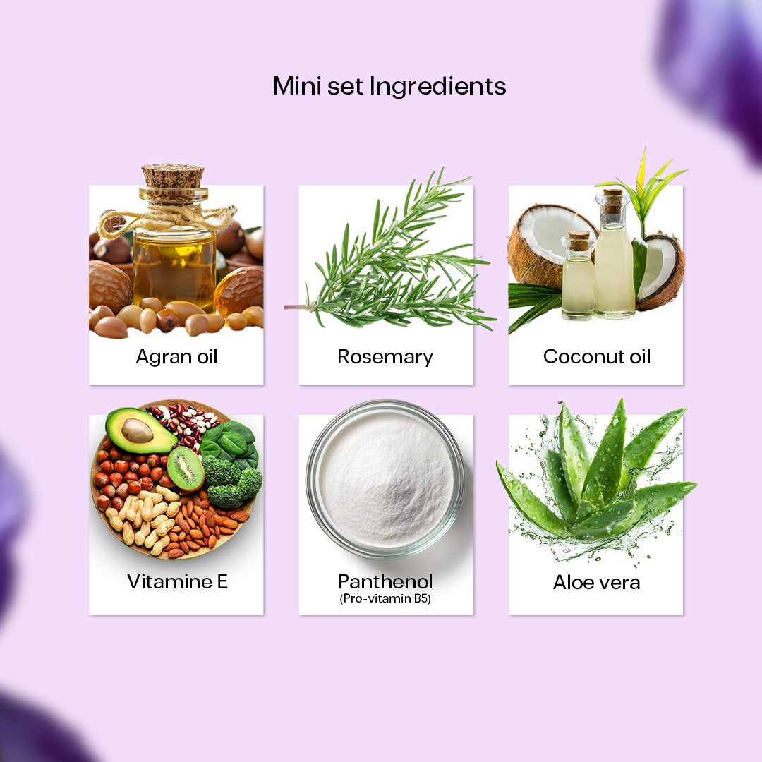 المكونات: زيت الأرغان، الجوجوبا، الصبار، الشيا، إكليل الجبل، الخزامى، النعناع، البانثينول.